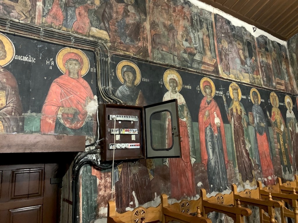 We stepped inside. The interior was busy and cluttered, every square inch covered with startlingly bright frescoes from the 11th and 16th centuries. The yiayiá showed us the marble columns and slabs, scavenged from the pagan temple to decorate the interior. She pointed to small sections of the stone floor that have been removed to display pre-Christian mosaics.