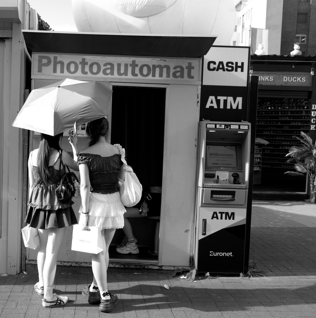 Curiously, photo booths abound in Berlin. Here, two girls visiting from Japan wait for their friend. This booth stood outside a tiny mall where you could rent a Trabant (the infamous East German car) for a day or two. The kitsch surrounding all things Soviet is strange, or maybe not. Nostalgia for Stalin helped to bring Putin to power. (See above: forgetting all the bad bits.)