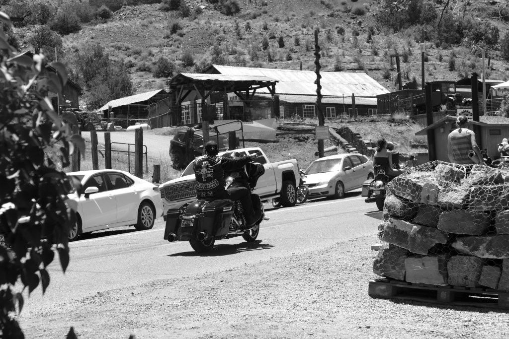 From our spot at Java Junction (coffee and cutting boards), bikers rumbled back and forth continuously. Small packs of giant men wearing identical patches, inscrutable behind their shades. There was a Hispanic MC, as well as hard-ass retirees in gleaming too-new bikes, tricked out with carriers and lights. I wondered how the wolves and lambs greeted each other at gas stations and bars, whether they ignored one another, whether there’s a protocol.