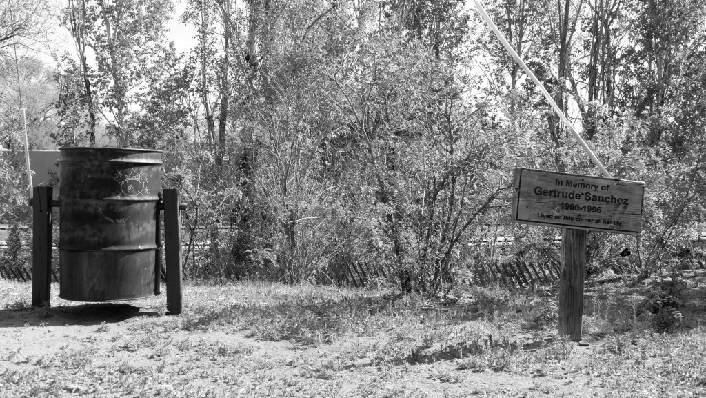 Here, a few steps from our rented place, a sign commemorates Gertrude Sanchez. But the sign is terse. It says that Gertrude merely endured, for 96 years, right here, on this spot. And now her house is gone, too. Not a hint of whether she raised a family, taught school, sang while she cooked, loved and was loved. She lived here to the end: from childhood to womanhood and into old age, her back window overlooking a deep and swift-moving Santa Fe River, that we may never see again. And maybe that’s all we need to know.