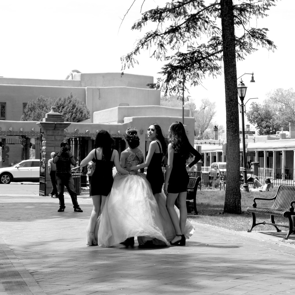 A Hispano wedding party poses in the churchyard beside the Cathedral Basilica of St. Francis, as an intruder looks on.